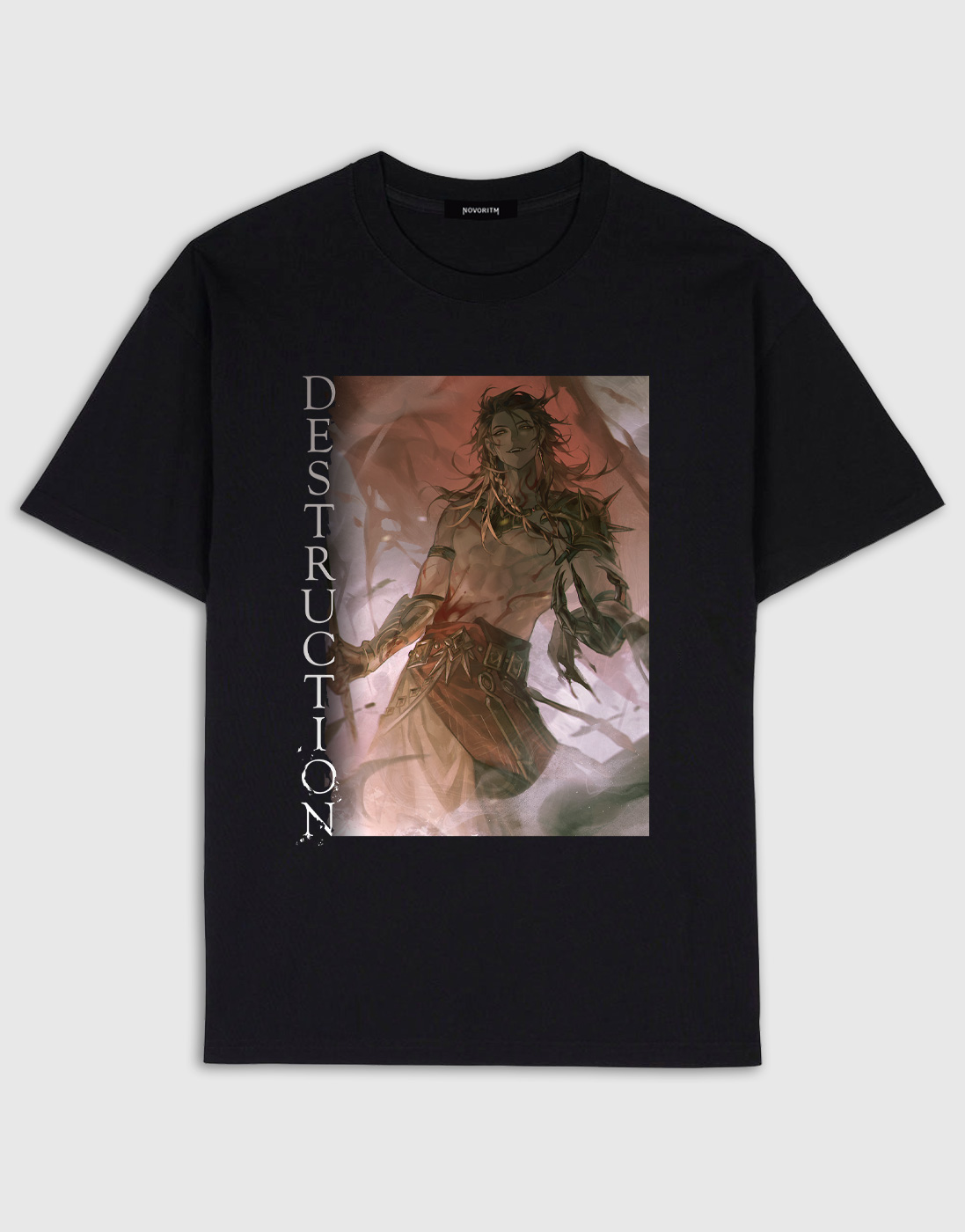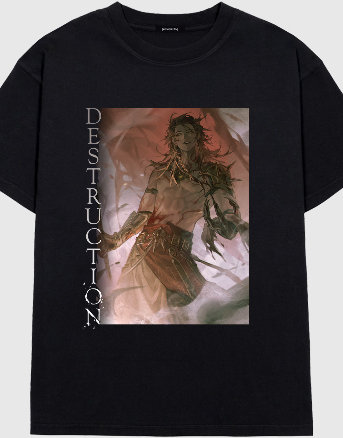 Футболка с крутым дизайном «Mydeimos» и вертикальной надписью «Destruction» от художника Søll.- Материал - 100% хлопок высокого качества