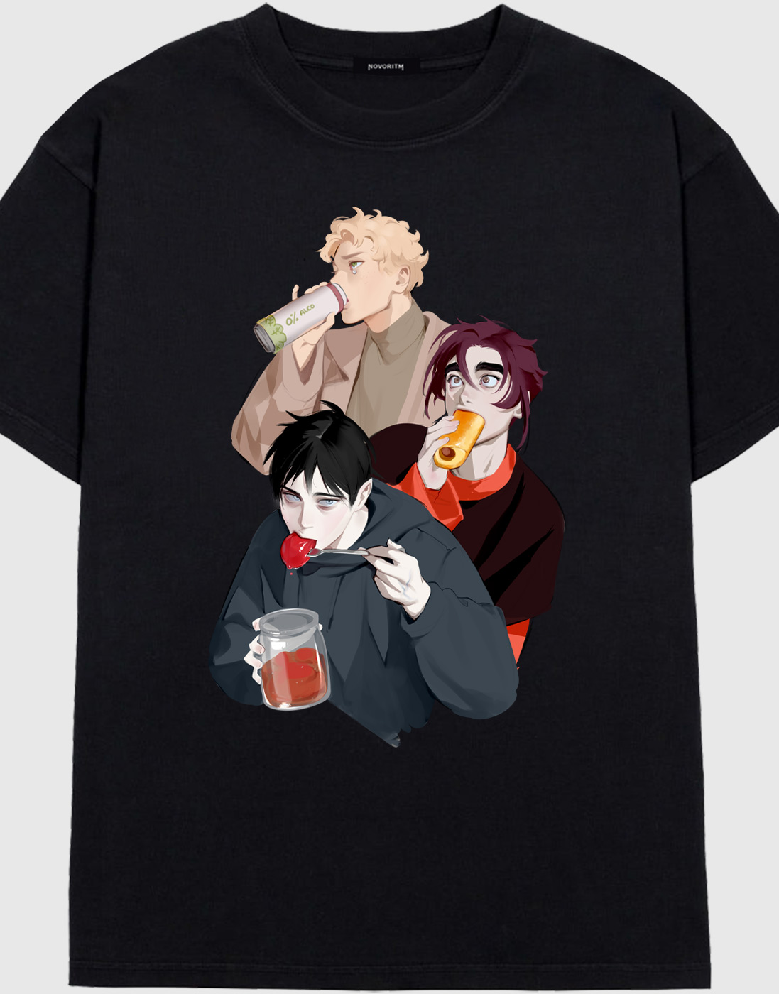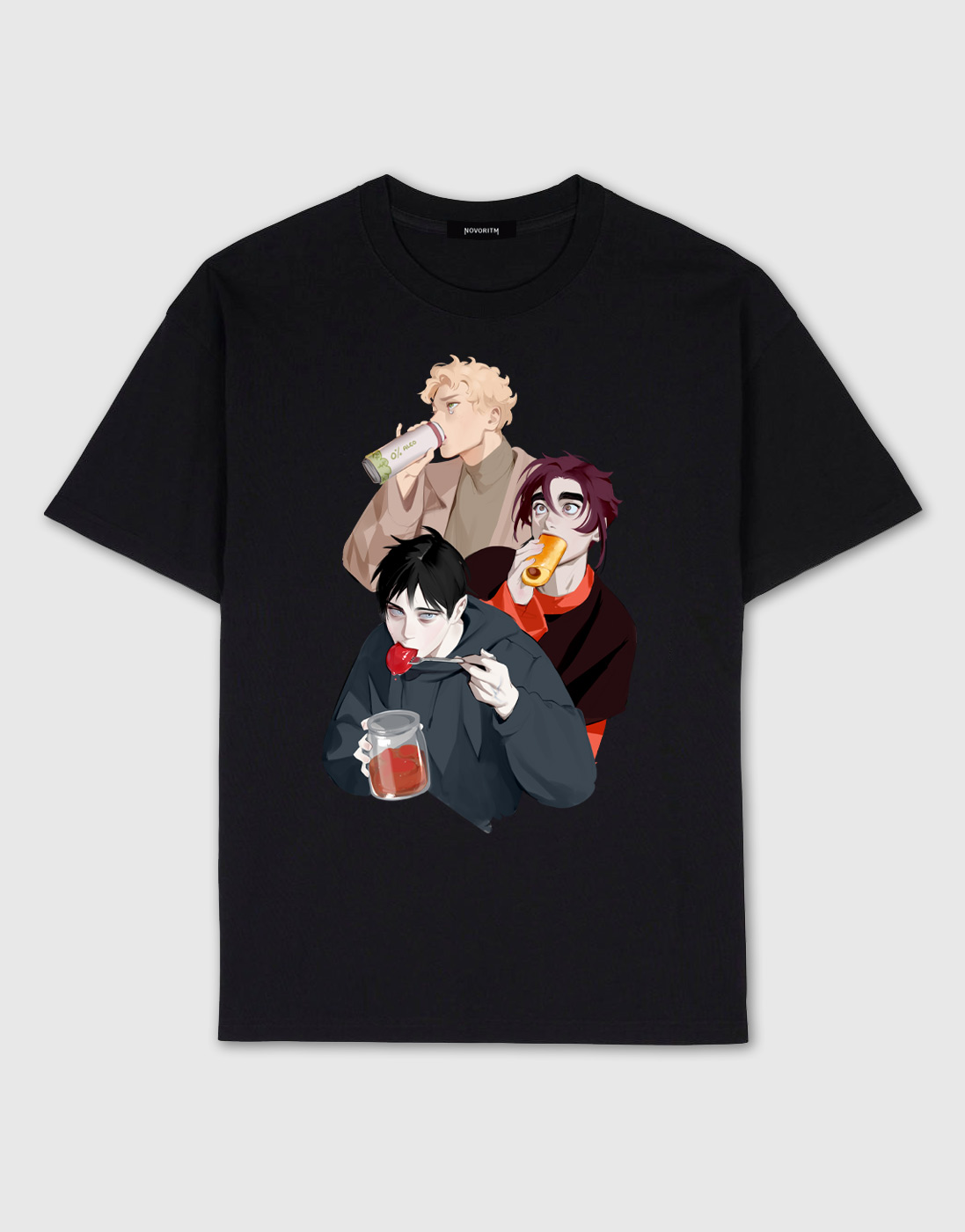 Футболка оверсайз с принтом «Трио и еда» от художницы BloXa.- Материал - 100% хлопок высокого качества