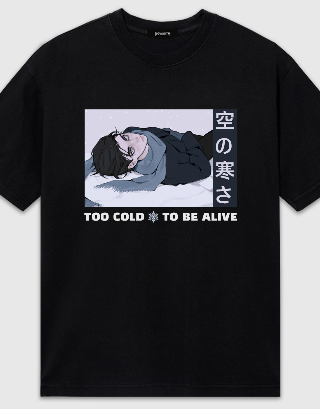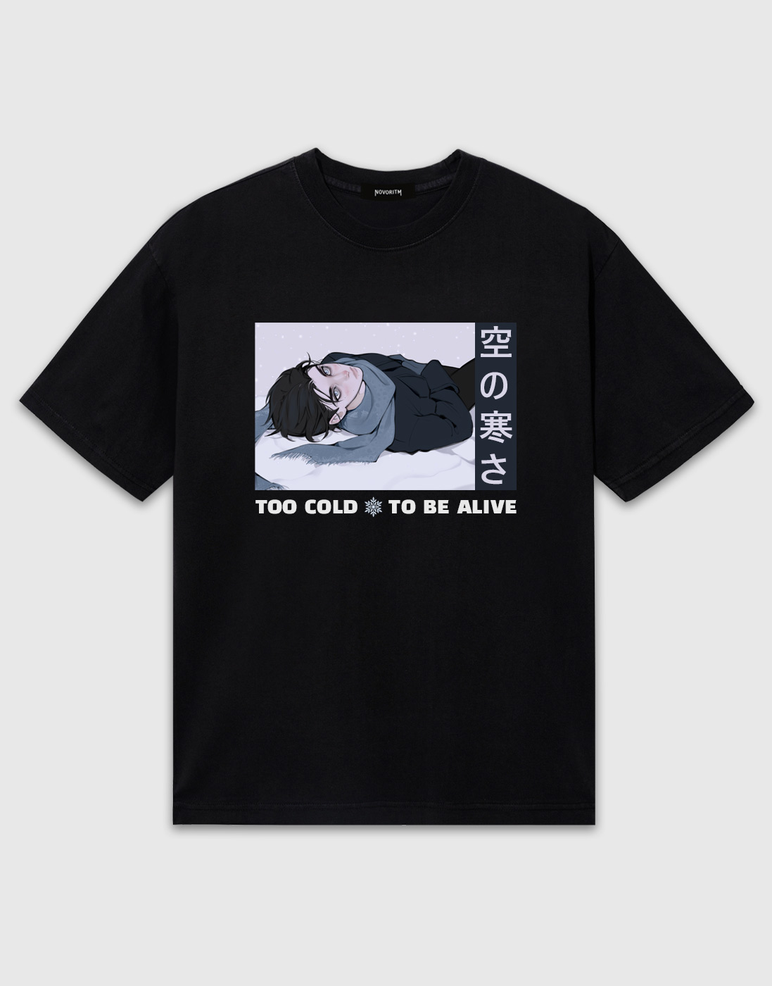Черная футболка с принтом "Too Cold To Be Alive" от художницы BloXa. Сбоку арта надпись "Пусто, холодно" японскими иероглифами.- Материал - 100% хлопок премиум качества