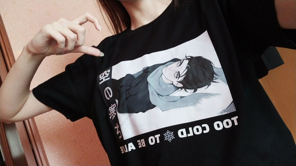 Вещает Кинн Олег: -Приятная футболка с вайбовым принтом, которая будет согревать меня этой зимой. Отдельное спасибо за японский текст, для меня это еще больший вайб, ахах. Футболка мягкая, приятна к телу, качественная, - думаю доживет до моих внуков даже при повседневной носке. Буду носить вместе с шоппером и согреваться от мысли, какой у меня крутой лук.
