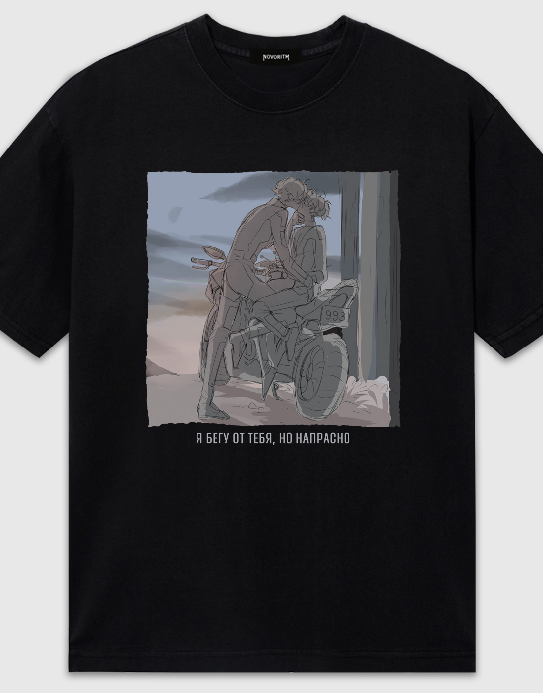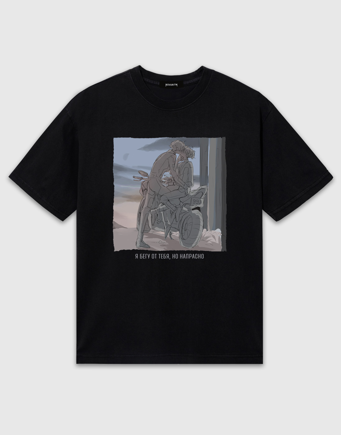 Черная футболка с цветным принтом "Я бегу от тебя, но напрасно" от художницы ilwha.- Материал - 100% хлопок премиум качества