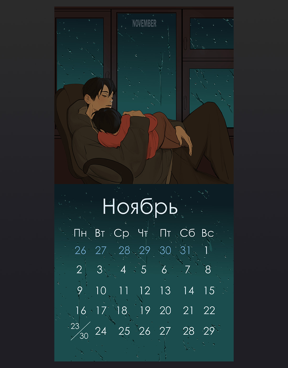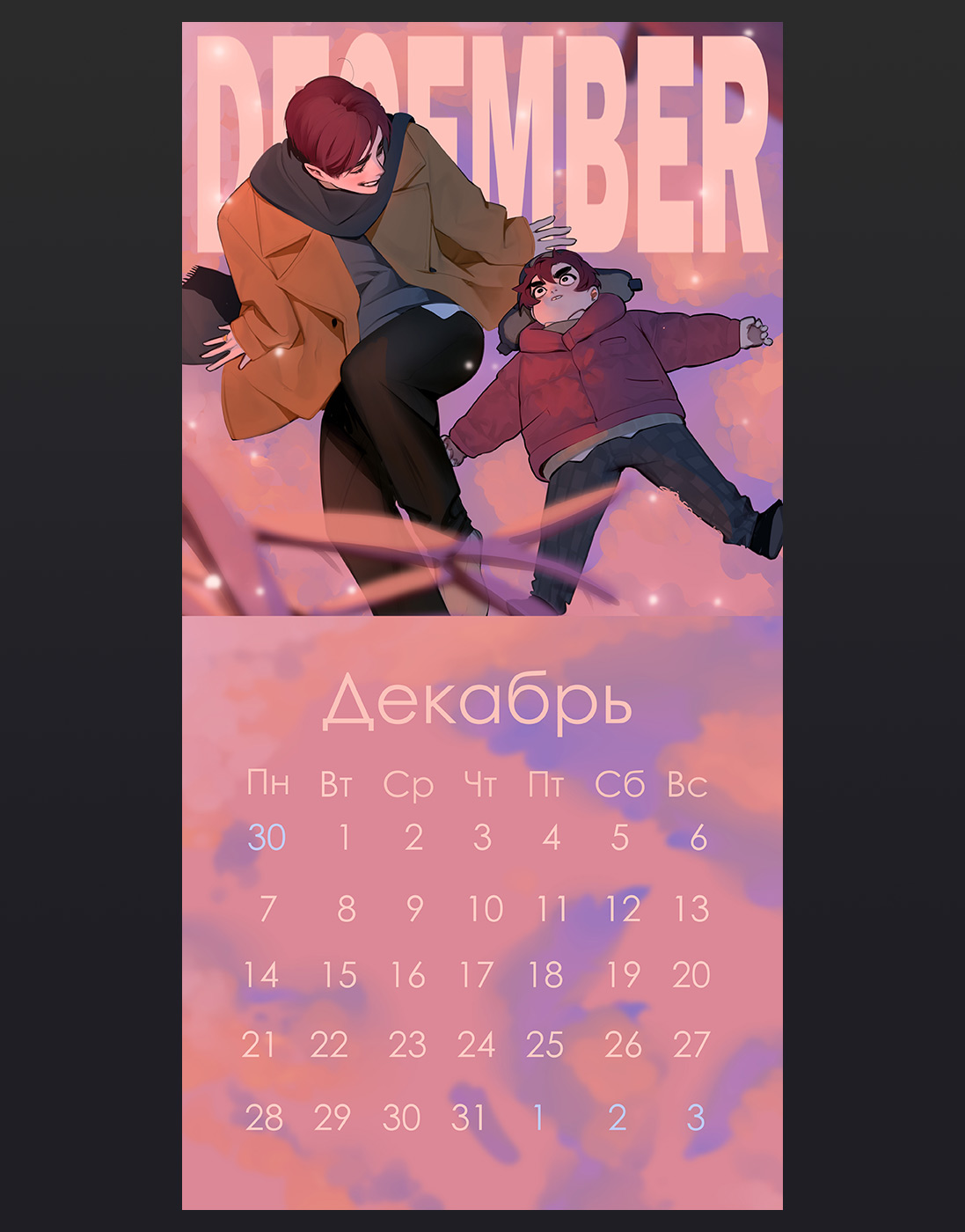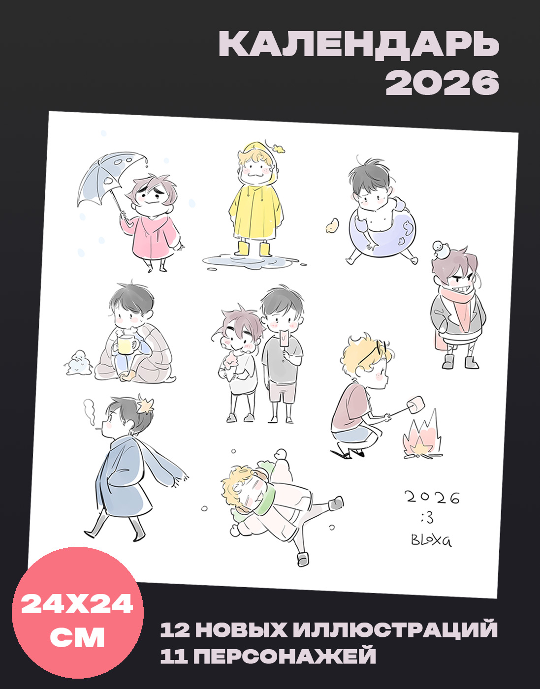 Настенный календарь на 2026 год от художницы BloXa, которая рисовала арт на каждый месяц специально для этого календаря. 12 отрисованных ярких иллюстраций, 11 разных персонажей на 28 страницах плотностью 130 г/м2, обложка - 300 г/м2 с металлическим кольцом. Атмосферные изображения и календарная сетка с крупными цифрами. Стильный дизайн с авторскими иллюстрациями на каждый месяц. Размер в сложенном виде 24x24 см, в развернутом - 24x48 см. Настоящее украшение вашей комнаты.Вам могут понравиться