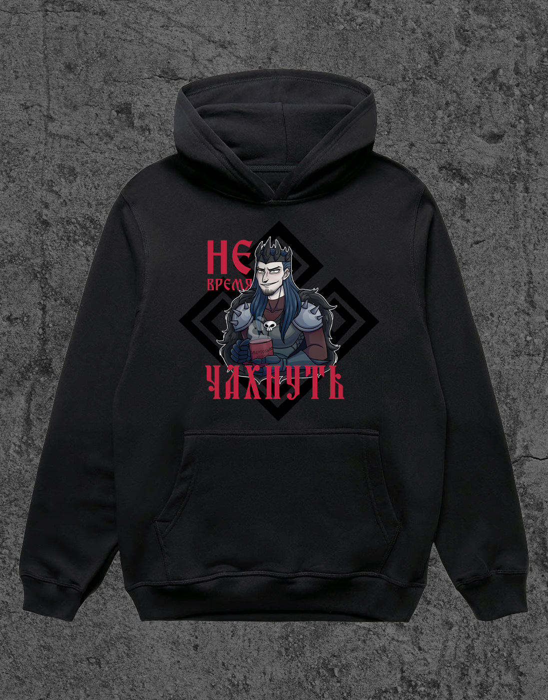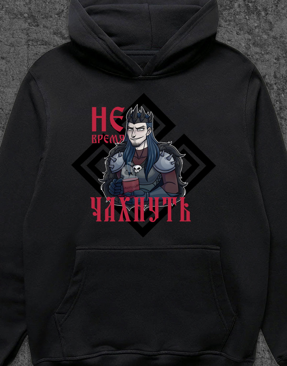 Худи с изображением Кощея и контрастной надписью «Не время чахнуть». В руке он держит кружку «Смертельно хорош».- Дизайн от художницы Застенчивый упырь