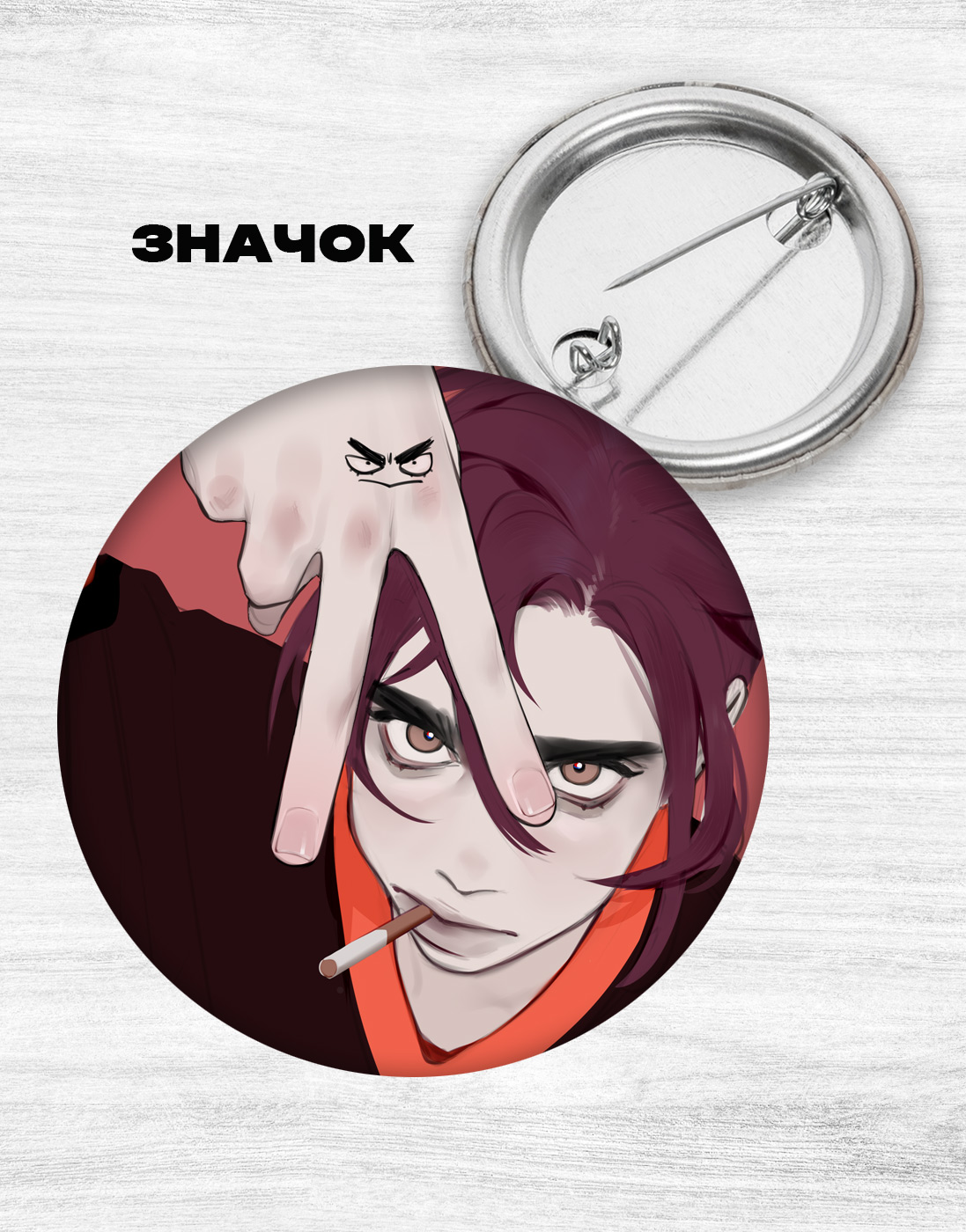 Круглый закатной значок из металла с нанесенным артом с глянцевым ламинированием. Диаметр - 37 мм.