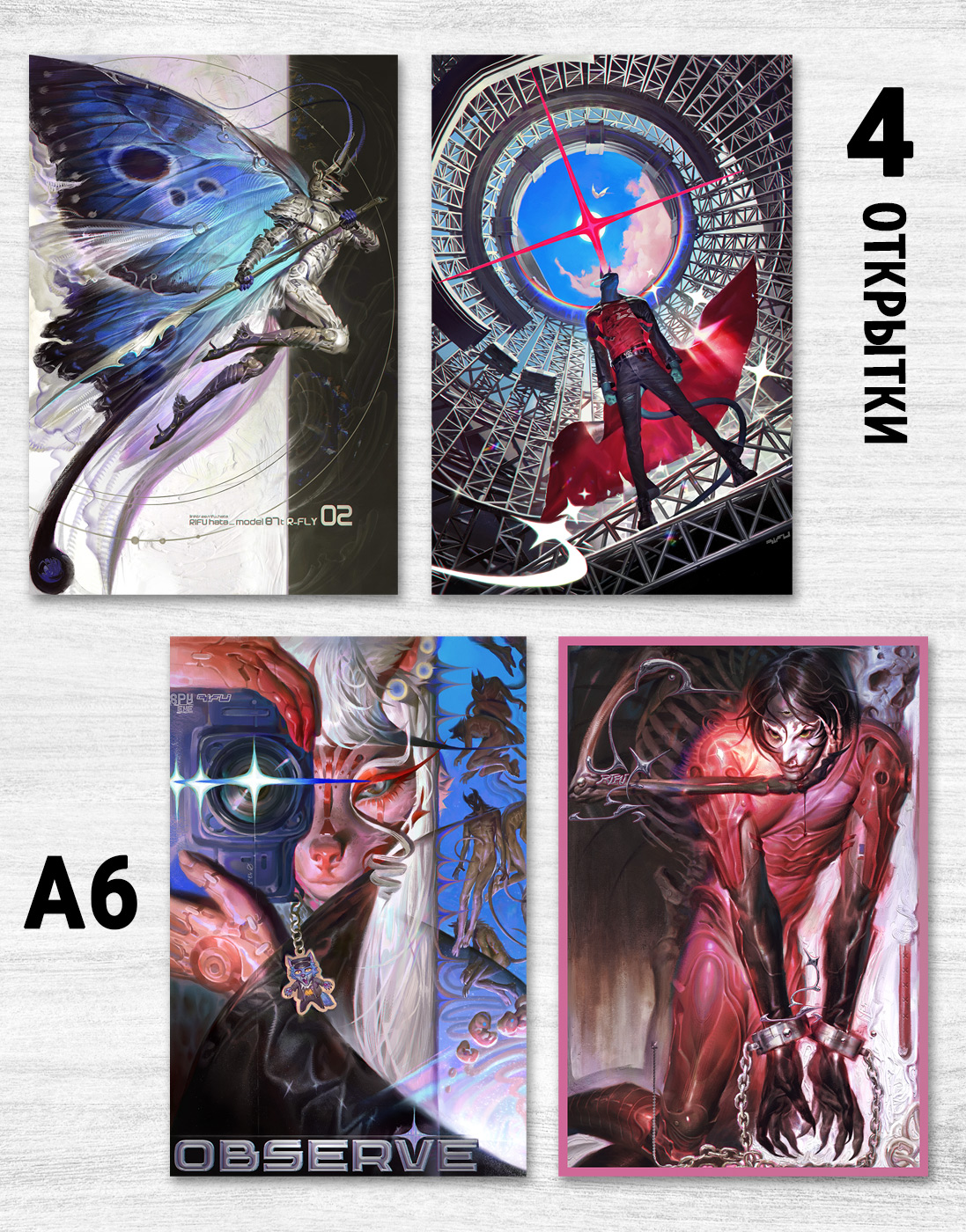 Набор включает в себя 4 открытки формата А6 с иллюстрациями от художника RIFU hata. Фантастически красивые арты напечатаны на плотном дизайнерском картоне 350 г/м2. Открытки двусторонние - на обороте есть разлинованное место для подписи или поздравления.Размер - 10,5х14,8 см