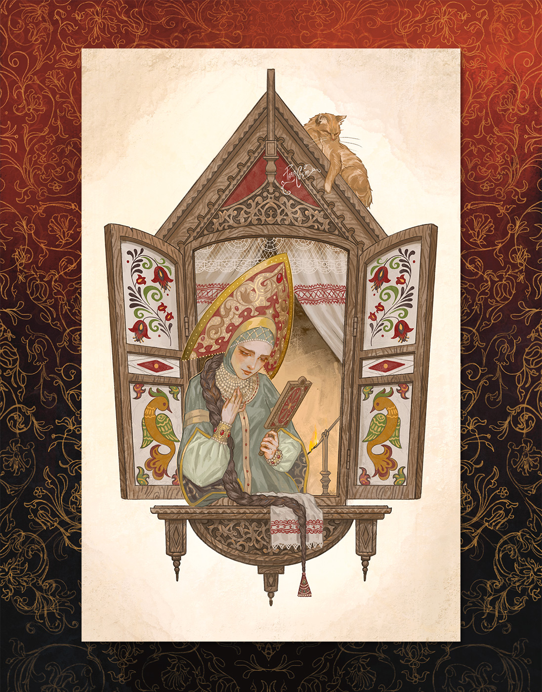 Открытка с артом «Царевна в окошке» художницы ParaCosm.- Иллюстрация напечатана на дизайнерском картоне с искрящимся эффектом плотностью 300 г/м2.