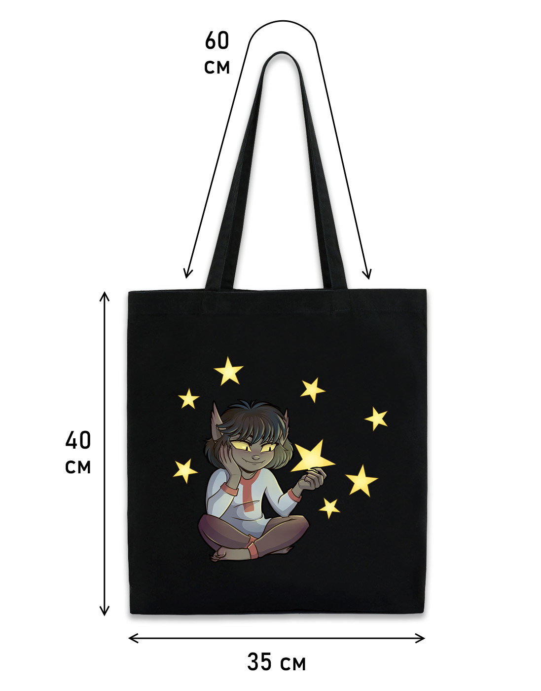 Черная сумка шоппер с красивым принтом, на котором домовой Игнат держит в руке звезду, которую ему принесла кикимора Варя. Дизайн выглядит современно и легко сочетается с одеждой, позволяя создавать интересные образы. Шоппер выполнен из крепкого материала плотностью 240 г/м2, тип плетения саржа. Ткань очень прочная и износостойкая. Ручки сумки усилены двойной строчкой, что позволяет переносить вес до 10 кг. Благодаря универсальному размеру 35х40 см, в сумку помещается все необходимое. Ноутбук, планшет, книги, документы А4, пара кроссовок, а в дополнительный внутренний карман можно положить смартфон, ключи и полезные мелочи, чтобы всегда были под рукой. Находка для ценителей славянской культуры, кто хочет выглядеть стильно и современно, при этом сохраняя традиции.Характеристики
