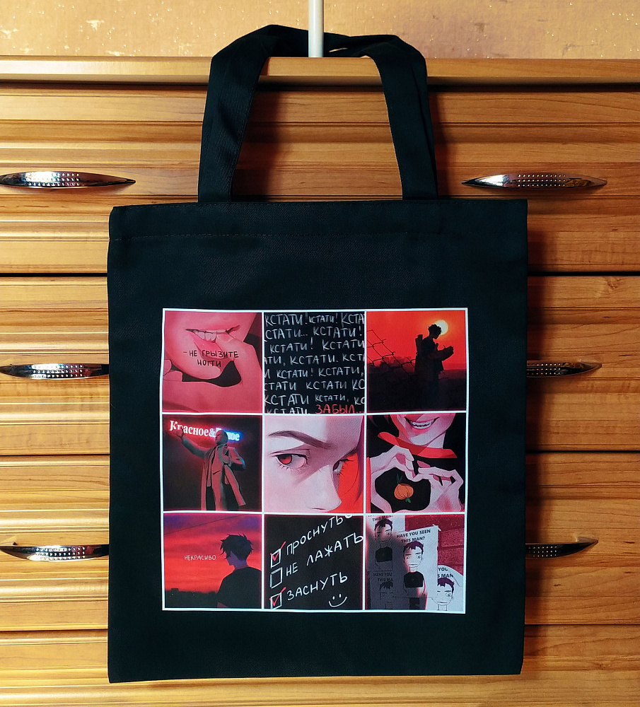 Отличный шоппер - плотный, вместительный, с кармашком для мелочи, принт четкий и яркий. Буду носить вместе с олеговой эстетикой, получится восхитительный лук :>