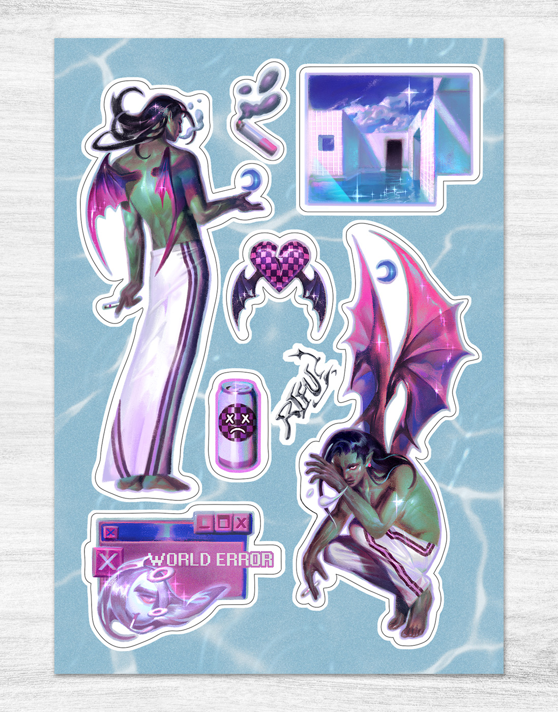 Стикерпак «Моя Vaporwave-фаза» от художника RIFU hata. Красивый способ напомнить окружающим о межпространственном этикете.- Наклейки с фигурной резкой по контуру.
